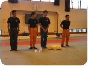 深谷消防署から4人の職員に来ていただき、心臓マッサージ、人口呼吸、AEDの使用等の講習会をおこないました。もしもの場合にそなえてみんな真剣に練習にはげみました。