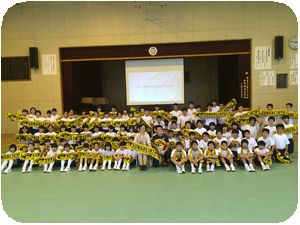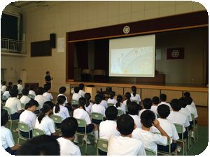 「耐えて勝つ」「夢や目標があるから挫折がある」をモットーに様々な大けがを乗り越え、ライバルとの競争を糧に、これまで第一戦で活躍してきたお話に生徒達は熱心に聴き入っていました。仕事とラグビーの両立に迷いラグビーをやめようかと思ったとき、あのエデイジョーンズ監督から「野村はチームに必要なプレーヤーだ」と言われ、現在までチームの運営に携わっているという内容でした。最後にサンゴリアスの応援タオルを生徒全員にいただきありがとうございました。校長先生が担任した中3時代から将来、ラグビー選手になる夢を実現した野村先輩。明中生もこのタオルを見るたびに、夢の実現にむけて頑張ってくれることでしょう。頑張れ明中生。