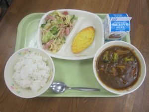 コーヒーミルク・カレーピラフドリア風・フライドチキン・クリスマスサラダ・野菜コンソメスープ