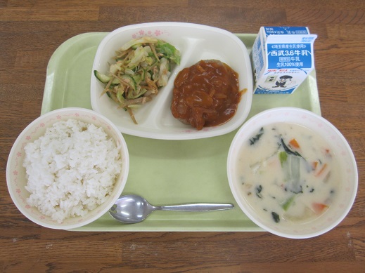 牛乳・ごはん・星のハンバーグ・キャベツのペペロンチーノ風・かき玉汁・クリスマスセレクトケーキ