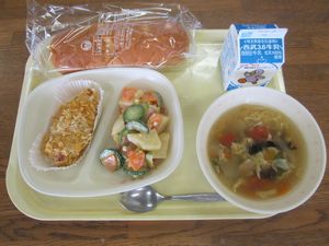 コーヒーミルク・カレーピラフドリア風・フライドチキン・クリスマスサラダ・野菜コンソメスープ