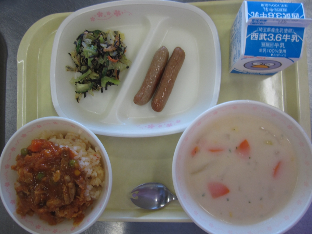 コーヒーミルク・カレーピラフドリア風・フライドチキン・クリスマスサラダ・野菜コンソメスープ
