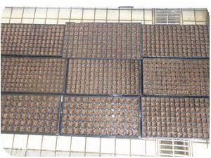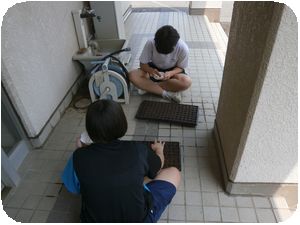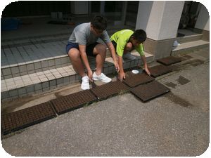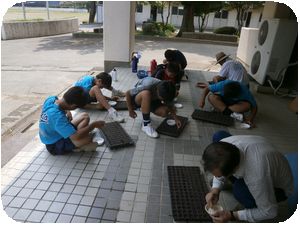 緑化委員とラグビー部のボランティアの生徒でありがとうの花の種まきが行われました。胡麻粒ほどの大きさの種を爪楊枝を使い1粒1粒まいていきます。みんな集中して無言で作業をしていました。