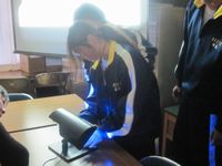 (特殊なローションを塗ってから手洗いをしてブラックライトで洗い残しを確認しました。その後、学校薬剤師さんには汚れの落ちる正しい手の洗い方を教わりました!)