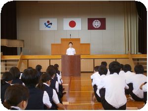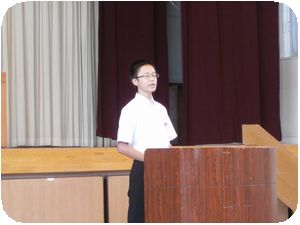 明日の英語弁論大会に出場する金井君が全校朝会で弁論を発表しました。