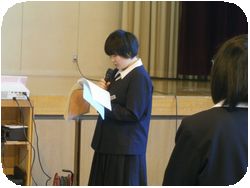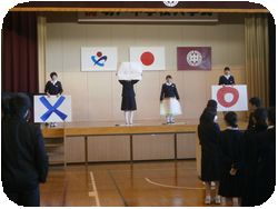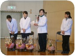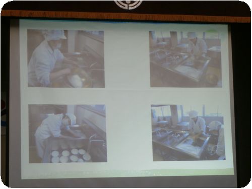 給食ができて片付けまでの流れがプロジェクターで紹介され。〇✕クイズや調理員さんへの感謝の作文、花束贈呈などや、調理員さんからの話がありました。
