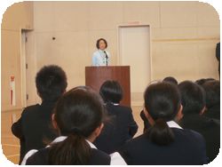 英語で人権はhuman rights と表現されるが『人間として正しい事』と理解してほしい。そして明中のみんなが自分を大切にして、他人も大切にできる人になってほしい。」と話しがありました。
