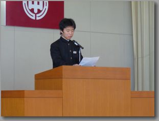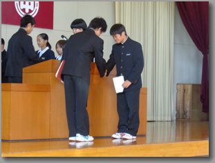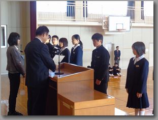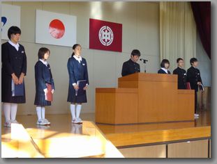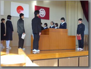 本日、生徒朝会にて後期学級委員長と新生徒会本部役員の任命式が行われました。新しく本部役員になったメンバーから「社会に役立つ生徒」「募金活動の充実」「あいさつ運動」「地域に役だつ活動」「時・場・礼の徹底」・・など方針が一人一人から発表されました。