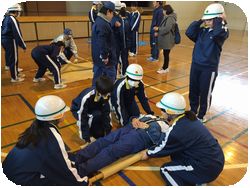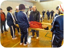 毛布や竹などで簡易担架をつくりケガ人を運ぶ訓練