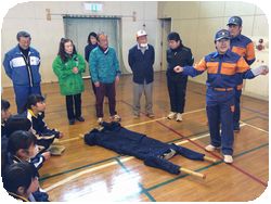 地域の消防団の方が指導してくださり、民生委員の方など、明戸地区一体となって訓練をおこないます。