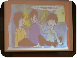 薬物は1度使ったら強い意志でもやめられないことや、たとえ10年間やらずにがまんできたとしても、脳が記憶しているためにフラッシュバックがおこることなど、薬物の恐ろしさを映像とアクションをまじえて熱心に説明してもらいました。