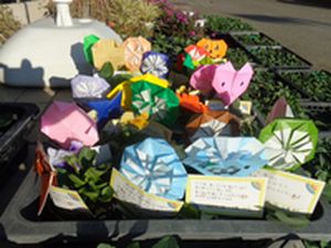 本日、明戸中学校の生徒88名の一人一人が、気持ちを込めてありがとうの花を完成させました。それぞれの花には、中学生からのメッセージカードと折り紙が添えられています。