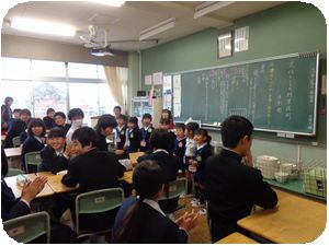 明戸幼稚園児が来校して各学年の教室で中学生と給食を一緒に食べました。