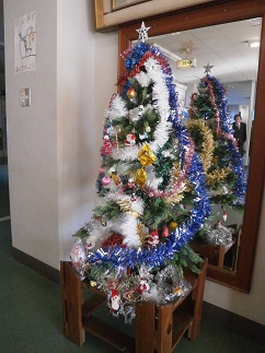 明戸中の玄関に今年もクリスマスツリーが登場しました。