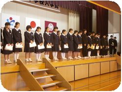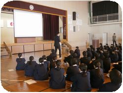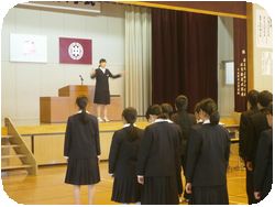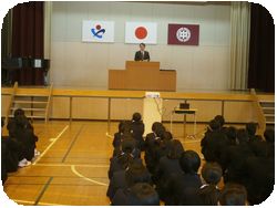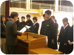 終業式では校長先生より各学年の生徒に向けて話しがありました。校歌の伴奏と指揮は今まで3年生の田島さんと坂田さんが担当してくれましたが、今回が最後で3学期始業式から2年生に代わります、1年間ご苦労さまでした。