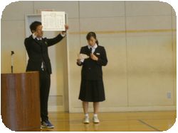 最後に全体指導と連絡があり、生徒会長より明戸中学校が「日本赤十字社」より、感謝状をいただいたという連絡がありました。これは生徒会を中心に、多年にわたり、毎月、募金活動に取り組んできたことが評価された結果です。今まで、募金の御協力ありがとうございました。今後も、宜しく、お願いします。
