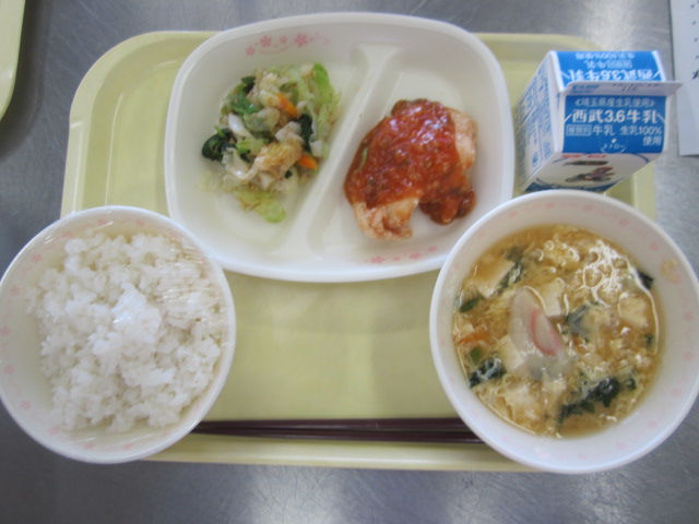 鶏肉は、タンパク質やコラーゲンが多く、髪や肌・骨などのつくる材料になります。 給食では、ヘルシーで食べやすいとりむね肉を使っています。お酢・お砂糖、ケチャップで作ったねぎたっぷり甘酢あんをかけました。