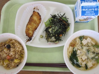 コーヒーミルク・カレーピラフドリア風・フライドチキン・クリスマスサラダ・野菜コンソメスープ