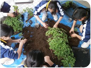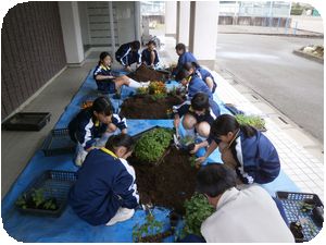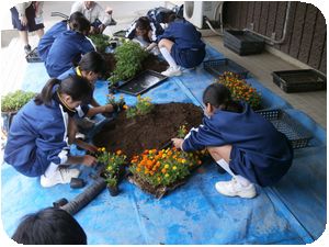 緑化委員会で花の苗(マリーゴールド、サルビア)のポットへ植えかえを行いました。