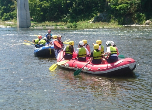 昼食のうどんと炊き込みご飯を食べ、午後は2年生がラフティングです。