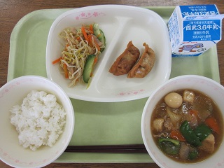 今日は、県産の「生揚げ・豚肉・牛乳」、深谷産の「ご飯・もやし・きゅうり」が使われています。